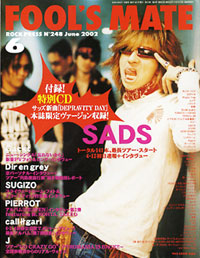 表紙・巻頭特集●SADS(特別CD付録つき)/新アルバム・インタヴュー+ツアー初日レポート。Gackt:Sg「忘れないから」ロング・インタヴュー。Dir en grey:京パーソナル・インタヴューetc。PIERROT:潤+KOHTA+TAKEOインタヴュー。カリガリ:『第7実験室』インタヴュー。SUGIZO:自宅フォト・セッション+新作インタヴュー。J:ツアー“GO CRAZY GO”全国参戦者レポート。BUCK-TICK、ムック、バロック、他。